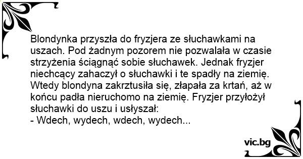 Eine Blondine mit Kopfhörern Ανάσες Blondine beim Arzt: Arzt: "Nun schalten Sie doch endlich mal den Walkman aus und nehmen Sie die Kopfhörer ab! "Blondine: "Geht nicht, die sind lebensnotwendig!" Dem Arzt wird es zu bunt und nimmt der Blondine die Kopfhörer ab. Die Blondine fängt an, wie ein Fisch nach Luft zu schnappen und blau... Det var en gång en blondin som kom in hos en frisör. Hon hade ett par hörlurar på huvudet. Hon sade till frisören att han absolut inte fick ta av henne hörlurarna. Frisören klippte och klippte och... Det var en gång en blondin som hade fått tid hos frisören. Hon gick in i salongen med gigantiska hörlurarna på huvudet, och vägrade ta av dem när frisören Lena skulle börja klippa. - Du måste ta... Blondi meni parturiin korvalappustereot korvilla. Kun hän istui parturin penkille hän sanoi: Korvalappustereoita ei saa ottaa pois tai muuten minä kuolen. Parturi kävi leikkaamaan blondin hiuksia.... A loira foi ao cabeleireiro com o seu walkman e disse para a cabeleireira: -Corte, mas não tira de jeito nenhum este walkman! A cabeleireira cortou tudo, mas precisou tirar o aparelho. Porém, ao... Certo dia, a loira foi cortar o cabelo num salão qualquer, o barbeiro e seu amigo logo notaram que ela usava fones de ouvido e estava bem concentrada no som dos fones. O Barbeiro então ficou com... En blondine som hørte på MP3-spilleren kom inn til frisøren og lurte på om hun kunne få klippet håret. - Ja, sa frisøren, men da må du ta av deg MP3-spilleren. - Nei! skrek blondina, og løp ut av... O blonda se duce la coafor cu o pereche de casti pe urechi,si zice: - Va rog sa ma tundeti dar in nici un caz sa nu-mi luati castile de pe urechi. Omul O coafeaza, o tunde,dupa care blonda pleaca.... Przychodzi blondynka do fryzjera i mówi: - Proszę mnie ostrzyc, ale nie może mi pan ściągnąć walkmana, bo umrę. Fryzjer strzyże, ale w pewnym momencie trąca słuchawki, które spadają. Blondynka... A loira foi salão cortar o cabelo mas, ela estava escutando Walkman. Quando sentou-se na cadeira do cabeleireiro, este falou: — Moça, tire o fone do ouvido para que eu possa cortar o seu cabelo. A... Eine Blondine kommt zum Friseur. Dieser sagt ihr, sie müsse zum Haare schneiden den Walkman abnehmen. Nach kurzem Zögern tut sie das. Auf einmal merkt der Friseur, dass sie gestorben ist. Er führt... Im Friseurladen. Friseur: "Bitte den Kopfhörer abnehmen, sonst kann ich ihre Haare nicht schneiden. Blondine: "Neh, will ich nicht". Nach dem x-ten Versuch, die Haare trotzdem zu schneiden,...