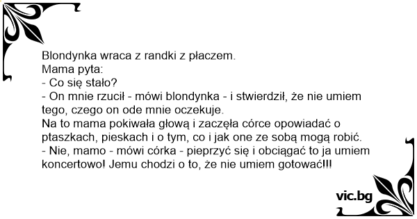 - Nie, mamo - mówi córka - pieprzyć się i obciągać to ja umiem koncertowo! Jemu chodzi o to, że nie umiem gotować!!!