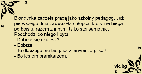 Egy szőke pszichológusnő az iskolában kap állást. Rögtön az első nap meglát egy fiút, aki nem futkározik a többiekkel, csak áll magában. Odamegy hozzá és megkérdezi: - Jól érzed magad? - Jól. -...
