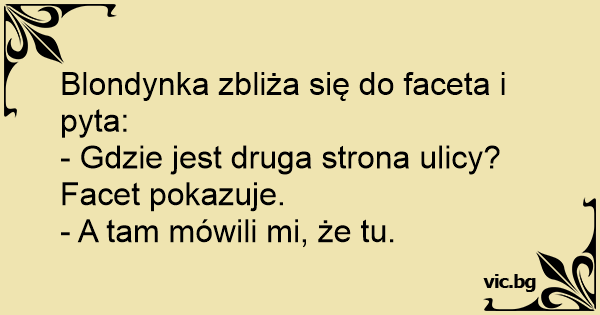 Blondýnka se ptá policisty: „Prosím vás, kde je druhá strana ulice?” Policajt jí to ukáže a žena se podiví: „Zajímavé. Tam mi říkali, že tady!”