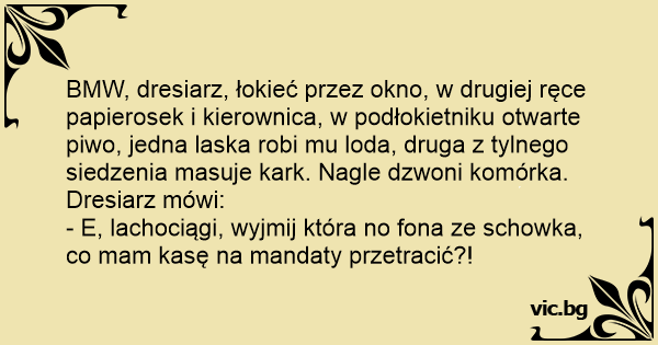 BMW, dresiarz, łokieć przez okno, w drugiej ręce papierosek i kierownica, w podłokietniku otwarte piwo, jedna laska robi mu loda, druga z tylnego siedzenia masuje kark. Nagle dzwoni komórka. Dresiarz mówi: