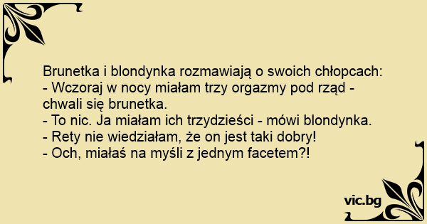 - Wczoraj w nocy miałam trzy orgazmy pod rząd - chwali się brunetka.