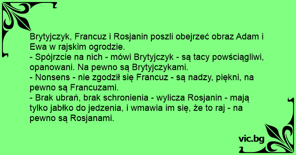 Brytyjczyk, Francuz i Rosjanin poszli obejrzeć obraz Adam i Ewa w rajskim ogrodzie.