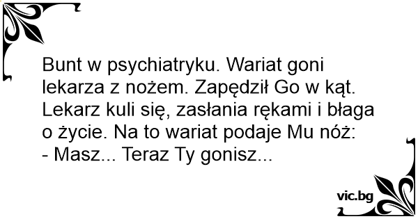 Bunt w psychiatryku. Wariat goni lekarza z nożem. Zapędził Go w kąt. Lekarz kuli się, zasłania rękami i błaga o życie. Na to wariat podaje Mu nóż: