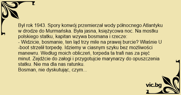Był rok 1943. Spory konwój przemierzał wody północnego Atlantyku w drodze do Murmańska. Była jasna, księżycowa noc. Na mostku polskiego statku, kapitan wzywa bosmana i rzecze: