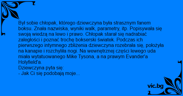 Był sobie chłopak, którego dziewczyna była strasznym fanem boksu. Znała nazwiska, wyniki walk, parametry, itp. Popisywała się swoją wiedzą na lewo i prawo. Chłopak starał się nadrabiać zaległości i poznać trochę bokserski światek. Podczas ich pierwszego intymnego zbliżenia dziewczyna rozebrała się, położyła na kanapie i rozchyliła nogi. Na wewnętrznej części lewego uda miała wytatuowanego Mike Tysona, a na prawym Evander'a Holyfield'a.