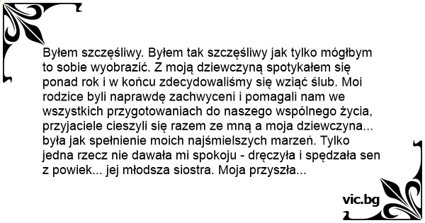 Byłem szczęśliwy. Byłem tak szczęśliwy jak tylko mógłbym to sobie wyobrazić. Z moją dziewczyną spotykałem się ponad rok i w końcu zdecydowaliśmy się wziąć ślub. Moi rodzice byli naprawdę zachwyceni i pomagali nam we wszystkich przygotowaniach do naszego wspólnego życia, przyjaciele cieszyli się razem ze mną a moja dziewczyna... była jak spełnienie moich najśmielszych marzeń. Tylko jedna rzecz nie dawała mi spokoju - dręczyła i spędzała sen z powiek... jej młodsza siostra. Moja przyszła szwagierka miała dwadzieścia lat, ubierała wyzywające obcisłe mini i króciutkie bluzeczki, eksponujące krągłości jej młodego,pięknego ciała. Często kiedy siedziałem na fotelu w salonie, niby przypadkiem schylała się po coś tak, że nawet nie przyglądając się,miałem przyjemny widok na jej majteczki. To nie mógł być przypadek. Nigdy nie zachowywała się tak kiedy w pobliżu był ktoś jeszcze. Któregoś dnia siostrzyczka mojej dziewczyny zadzwoniła do mnie i poprosiła abym po drodze do domu wstąpił do nich rzucić okiem na ślubne zaproszenia. Kiedy przyjechałem była sama w domu. Podeszła do mnie tak blisko, że czułem słodki zapach jej perfum i wyszeptała, że wprawdzie będę żonaty,ale ona pragnie mnie tak bardzo... i czuje, że nie potrafi tego uczucia pohamować... i nawet nie chce. Powiedziała, że chce się ze mną tylko ten jeden raz, zanim wezmę ślub z jej siostrą i przysięgnę jej miłość i wierność póki śmierć nas nie rozłączy. Byłem w szoku i nie mogłem wykrztusić z siebie nawet jednego słowa. Powiedziała "Idę do góry, do mojej sypialni. Jeśli chcesz, chodź do mnie i weź mnie, nie będę czekać długo" Stałem jak skamieniały i obserwowałem ją jak wchodziła po schodach kusząco poruszając biodrami. Kiedy była już na górze ściągnęła majteczki i rzuciła je w moją stronę. Stałem tak przez chwilę, po czym odwróciłem się i poszedłem do drzwi frontowych. Otworzyłem drzwi i wyszedłem z domu, prosto, w kierunku zaparkowanego przed domem samochodu.