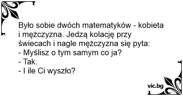 Było sobie dwóch matematyków - kobieta i mężczyzna. Jedzą kolację przy świecach i nagle mężczyzna się pyta: