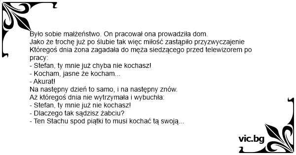 Jako że trochę już po ślubie tak więc miłość zastąpiło przyzwyczajenie Któregoś dnia żona zagadała do męża siedzącego przed telewizorem po pracy: