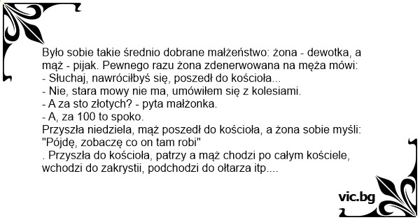 . Przyszła do kościoła, patrzy a mąż chodzi po całym kościele, wchodzi do zakrystii, podchodzi do ołtarza itp. Zdziwiona podchodzi i pyta, co on najlepszego wyprawia. A mąż na to: