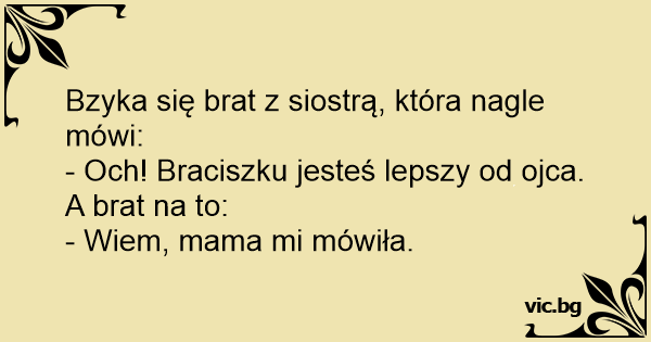 Dwóch przedszkolaków przechwala się nawzajem: - A wiesz, mój tata jest lepszy od Twojego taty! - A mój brat jest lepszy od Twojego brata! - Za to moja mama jest lepsza od Twojej mamy! - A wiesz, tu to chyba masz rację, bo nawet mój tata tak mówi.