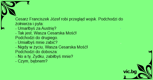 Cesarz Franciszek Józef robi przegląd wojsk. Podchodzi do żołnierza i pyta: