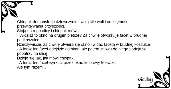 - Widzisz to okno na drugim piętrze? Za chwilę otworzy je facet w brudnej podkoszulce.