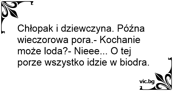 Chłopak i dziewczyna. Późna wieczorowa pora.- Kochanie może loda?- Nieee... O tej porze wszystko idzie w biodra.