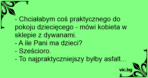 Магазин ковров. Покупатель: - Мне в детскую, что-нибудь не очень маркое... - Сколько детей? - Семеро. - Лучше заасфальтируйте!
