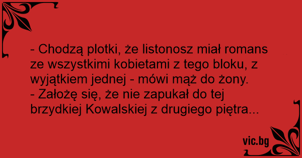 Mąż do żony w mieszkaniu w wieżowcu: - Wiesz, chodzą plotki, że listonosz miał romans ze wszystkimi kobietami z tego bloku z wyjątkiem jednej. - Założę się, że to ta przykra pani Selfridge z...