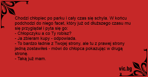 Chodzi chłopiec po parku i cały czas się schyla. W końcu podchodzi do niego facet, który już od dłuższego czasu mu się przyglądał i pyta się go: