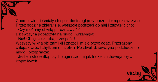 Chorobliwie nieśmiały chłopak dostrzegł przy barze piękną dziewczynę. Przez godzinę zbierał się, wreszcie podszedł do niej i zapytał cicho: