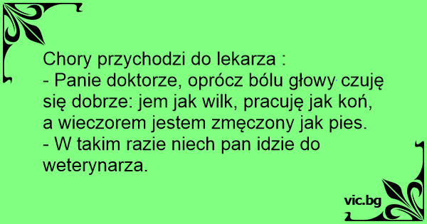 - Panie doktorze, oprócz bólu głowy czuję się dobrze: jem jak wilk, pracuję jak koń, a wieczorem jestem zmęczony jak pies.