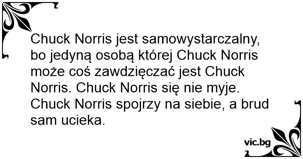 Chuck Norris jest samowystarczalny, bo jedyną osobą której Chuck Norris może coś zawdzięczać jest Chuck Norris. Chuck Norris się nie myje. Chuck Norris spojrzy na siebie, a brud sam ucieka.