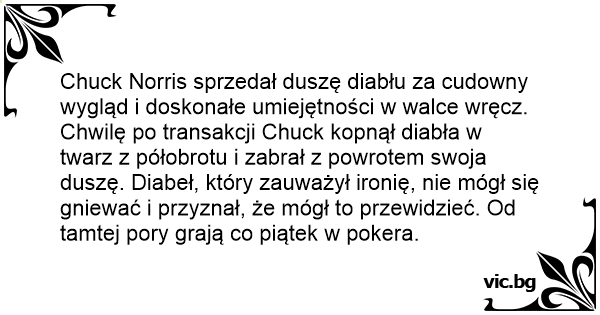 Chuck Norris sprzedał duszę diabłu za cudowny wygląd i doskonałe umiejętności w walce wręcz. Chwilę po transakcji Chuck kopnął diabła w twarz z półobrotu i zabrał z powrotem swoja duszę. Diabeł, który zauważył ironię, nie mógł się gniewać i przyznał, że mógł to przewidzieć. Od tamtej pory grają co piątek w pokera.