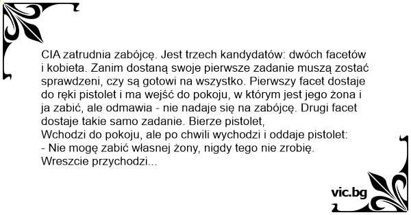 Egzamin w szkole agentów CIA. Do sali wchodzi student. Instruktor mówi: - W pokoju obok znajduje się Twoja dziewczyna. Tu masz pistolet. Masz ją zabić w 30 sekund. Po 30 sekundach student wraca i mówi: - Sorry, nie mogłem tego zrobić. Kolejny student....