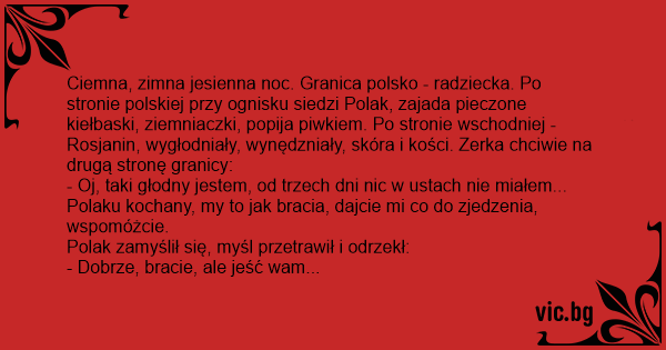 Ciemna, zimna jesienna noc. Granica polsko - radziecka. Po stronie polskiej przy ognisku siedzi Polak, zajada pieczone kiełbaski, ziemniaczki, popija piwkiem. Po stronie wschodniej - Rosjanin, wygłodniały, wynędzniały, skóra i kości. Zerka chciwie na drugą stronę granicy: