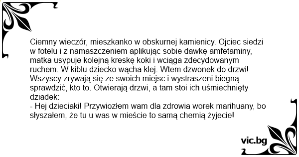 Ciemny wieczór, mieszkanko w obskurnej kamienicy. Ojciec siedzi w fotelu i z namaszczeniem aplikując sobie dawkę amfetaminy, matka usypuje kolejną kreskę koki i wciąga zdecydowanym ruchem. W kiblu dziecko wącha klej. Wtem dzwonek do drzwi! Wszyscy zrywają się ze swoich miejsc i wystraszeni biegną sprawdzić, kto to. Otwierają drzwi, a tam stoi ich uśmiechnięty dziadek: