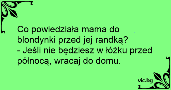 Μητρική συμβουλή !!! Συμβουλή πρίν απο το ραντεβού Ξανθιά μαμά - ξανθιά κόρη. Какво казва майката на една блондинка на дъщеря си преди първата й среща с момче? Qu'est-ce que dit une maman à sa fille blonde qui s'apprête à sortir ? Какво казва майката на дъщеря си блондинка, която излиза вечерта: Was sagt die Mutter der Blondine ihrer Tochter vor dem ersten Date? "Wenn Du vor 12 nicht im Bett bist, komm nach Hause!" Συμβουλή ξανθιάς μαμάς στην ξανθιά κόρη πριν την έξοδό της... Αν μέχρι τις 11:00 δεν είσαι στο κρεβάτι να γυρίσεις σπίτι. Was sagt eine Blondine am Samstagabend um 23 Uhr? "Wenn ich um 23:30 Uhr nicht im Bett bin, gehe ich nach Hause." What did the blonde mother say to the blonde daughter? "If you're not in bed by 12, you can come home!" Quel est le conseil que donne la mère d'une blonde à sa fille quand elle sort le soir ? Ma fille, si tu n'es pas couchée avant minuit, rentres à la maison !!! Vad gör blondinen om hon inte är i säng före 12? Tar sin handväska och går hem Cosa ha detto la mamma della bionda a suo figlia prima che quest’ultima andasse ad un appuntamento ? Se non sei a letto per mezzanotte, torna a casa. Mitä äiti sanoi blondille, kun tämä oli lähdössä treffeille? - Jos et ole sängyssä klo 12:een mennessä, niin tule kotiin. Hvad sagde blondinens mor inden blondinens første date? - Hvis du ikke er i seng inden kl 24:00, så kom hjem. Vad gör en blondin som inte är i säng före midnatt? – Ger upp och går hem från krogen.