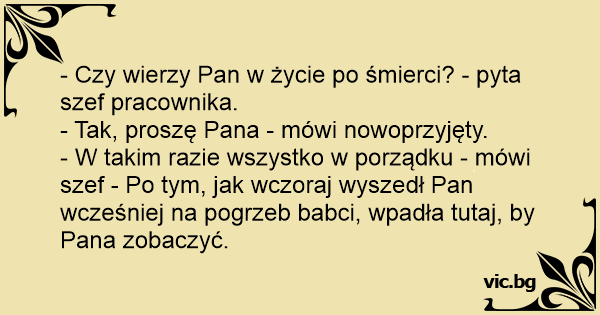 Főnök az egyik fiatal alkalmazottjához: - Géza, hiszel a halál utáni életben? - Egyáltalán nem. Miért? - Akkor felvilágosítalak, hogy a nagymamád, akinek a temetésére Szabadnapot kaptál, az előbb...