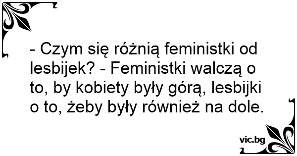 - Czym się różnią feministki od lesbijek? - Feministki walczą o to, by kobiety były górą, lesbijki o to, żeby były również na dole.
