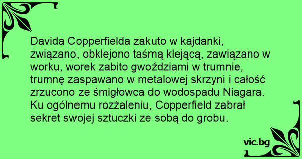 Davida Copperfielda zakuto w kajdanki, związano, obklejono taśmą klejącą, zawiązano w worku, worek zabito gwoździami w trumnie, trumnę zaspawano w metalowej skrzyni i całość zrzucono ze śmigłowca do wodospadu Niagara. Ku ogólnemu rozżaleniu, Copperfield zabrał sekret swojej sztuczki ze sobą do grobu.