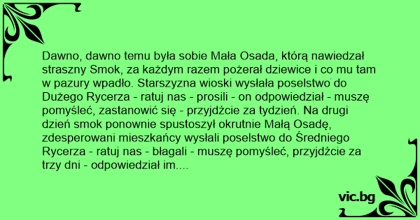 Dawno, dawno temu była sobie Mała Osada, którą nawiedzał straszny Smok, za każdym razem pożerał dziewice i co mu tam w pazury wpadło. Starszyzna wioski wysłała poselstwo do Dużego Rycerza - ratuj nas - prosili - on odpowiedział - muszę pomyśleć, zastanowić się - przyjdźcie za tydzień. Na drugi dzień smok ponownie spustoszył okrutnie Małą Osadę, zdesperowani mieszkańcy wysłali poselstwo do Średniego Rycerza - ratuj nas - błagali - muszę pomyśleć, przyjdźcie za trzy dni - odpowiedział im. Następnego dnia Smok napadł na Małą Osadę ponownie. Poselstwo wysłano więc do Małego Rycerza - ratuj nas, jesteś naszą ostatnią nadzieją, ale powiedz ile dni będziesz się zastanawiał, czy zaatakować Smoka. Na to Mały Rycerz odpowiedział: tu nie ma się co zastanawiać, tu trzeba spier.... Ć!!!