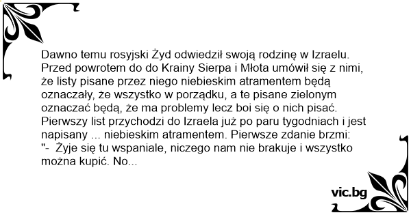 Dawno temu rosyjski Żyd odwiedził swoją rodzinę w Izraelu. Przed powrotem do do Krainy Sierpa i Młota umówił się z nimi, że listy pisane przez niego niebieskim atramentem będą oznaczały, że wszystko w porządku, a te pisane zielonym oznaczać będą, że ma problemy lecz boi się o nich pisać.