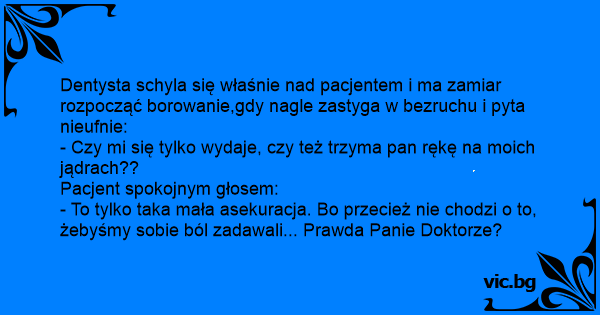 Dentysta schyla się właśnie nаd pacjentem i ma zamiar rozpocząć borowanie,gdy nagle zastyga w bezruchu i pyta nieufnie: