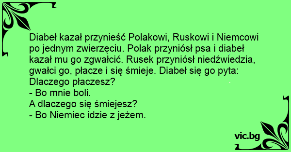 Diabeł kazał przynieść Polakowi, Ruskowi i Niemcowi po jednym zwierzęciu. Polak przyniósł psa i diabeł kazał mu go zgwałcić. Rusek przyniósł niedźwiedzia, gwałci go, płacze i się śmieje. Diabeł się go pyta: