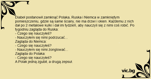 Diabeł postanowił zamknąć Polaka, Ruska i Niemca w zamkniętym pomieszczeniu, gdzie są same ściany, nie ma drzwi i okien. Każdemu z nich dał po 2 metalowe kulki i dał im tydzień, aby nauczyli się z nimi coś robić. Po tygodniu zagląda do Ruska: