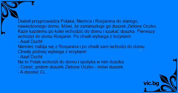 Diabeł przyprowadza Polaka, Niemca i Rosjanina do starego, nawiedzonego domu. Mówi, że zamieszkuje go duszek Zielone Oczko. Każe każdemu po kolei wchodzić do domu i szukać duszka. Pierwszy wchodzi do domu Rosjanin. Po chwili wybiega z krzykiem: