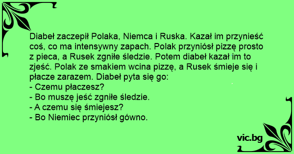 Diabeł zaczepił Polaka, Niemca i Ruska. Kazał im przynieść coś, co ma intensywny zapach. Polak przyniósł pizzę prosto z pieca, a Rusek zgniłe śledzie. Potem diabeł kazał im to zjeść. Polak ze smakiem wcina pizzę, a Rusek śmieje się i płacze zarazem. Diabeł pyta się go: