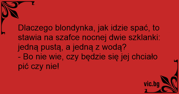 Kodėl blondinė prieš eidama miegoti ant naktinio stalelio pasideda dvi stiklines: vieną tuščią, kitą su vandeniu? Ats. Nes gali norėti gerti, gali ir nenorėti...