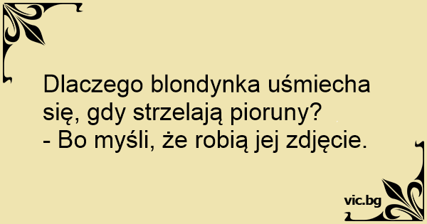 Idą dwie blondynki przez burzę. Pierwsza pyta się drugiej: - Co robisz? - Uśmiecham się. - A po co? - By dobrze wypaść na zdjęciu.
