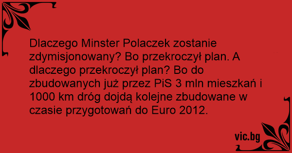 Dlaczego Minster Polaczek zostanie zdymisjonowany? Bo przekroczył plan. A dlaczego przekroczył plan? Bo do zbudowanych już przez PiS 3 mln mieszkań i 1000 km dróg dojdą kolejne zbudowane w czasie przygotowań do Euro 2012.