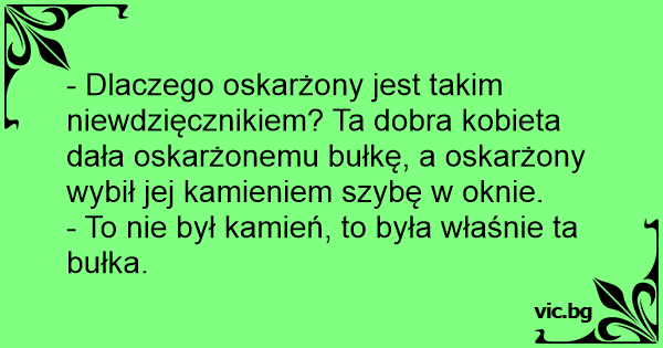 - Dlaczego oskarżony jest takim niewdzięcznikiem? Ta dobra kobieta dała oskarżonemu bułkę, a oskarżony wybił jej kamieniem szybę w oknie.