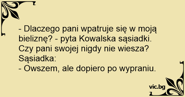- Dlaczego pani wpatruje się w moją bieliznę? - pyta Kowalska sąsiadki. Czy pani swojej nigdy nie wiesza?