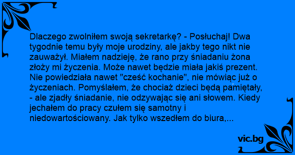 - Dzisiaj jest taki piękny dzień, w dodatku są pana urodziny, może zjemy gdzieś razem obiad? Zgodziłem się, - bo była to najmilsza rzecz, jaką od rana usłyszałem. Poszliśmy do cudownej restauracji, zjedliśmy obiad w przyjemnej atmosferze i wypiliśmy po lampce wina. W drodze powrotnej do biura sekretarka powiedziała: