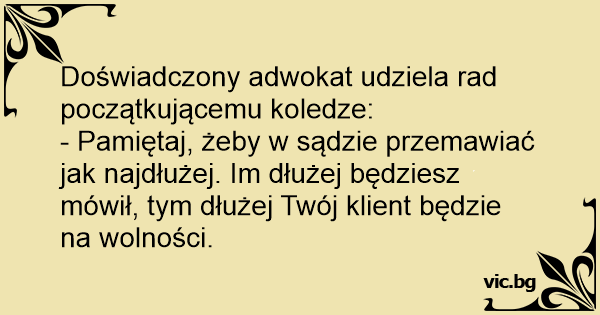 - Pamiętaj, żeby w sądzie przemawiać jak najdłużej. Im dłużej będziesz mówił, tym dłużej Twój klient będzie na wolności.