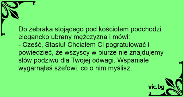 - Cześć, Stasiu! Chciałem Ci pogratulować i powiedzieć, że wszyscy w biurze nie znajdujemy słów podziwu dla Twojej odwagi. Wspaniale wygarnąłeś szefowi, co o nim myślisz.