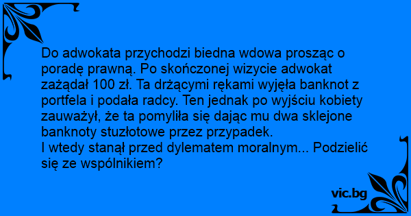 Do adwokata przychodzi biedna wdowa prosząc o poradę prawną. Po skończonej wizycie adwokat zażądał 100 zł. Ta drżącymi rękami wyjęła banknot z portfela i podała radcy. Ten jednak po wyjściu kobiety zauważył, że ta pomyliła się dając mu dwa sklejone banknoty stuzłotowe przez przypadek.