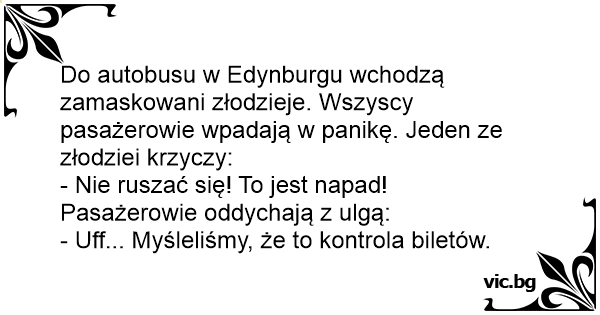 Влегува разбојник во автобус, вади пиштол и почнува да се дере: - Раце горе! Ова е грабеж! Еден од патниците воздивнува со олеснување и го пцуе: - Море мрш у пи*ку материну! Мислев дека е контрола?