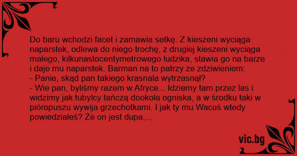 Do baru wchodzi facet i zamawia setkę. Z kieszeni wyciąga naparstek, odlewa do niego trochę, z drugiej kieszeni wyciąga małego, kilkunastocentymetrowego ludzika, stawia go na barze i daje mu naparstek. Barman na to patrzy ze zdziwieniem: